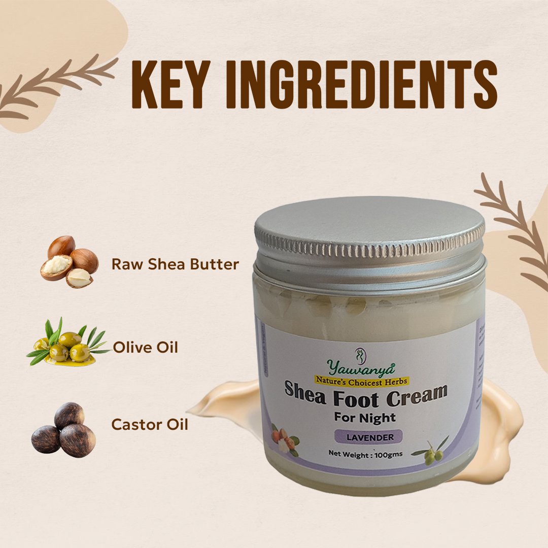 Yauvanya Shea Foot Cream is a unique combination of extremely rich ingredients which result in an excellent foot care product. Ingredients like raw shea butter, vegetable glycerine, castor oil, olive oil and essential oils help in skin nourishment. This cream penetrates deep into the skin, increases skin firmness and elasticity leaving the skin soft and smooth.