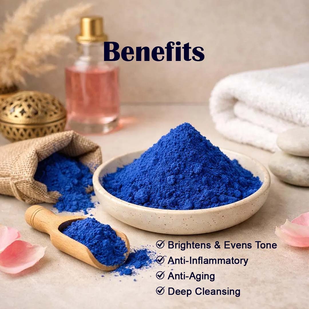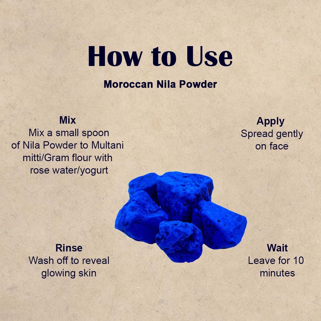 Yauvanya Original Moroccan Nila Powder is a traditional beauty secret from the Sahara desert that has been treasured for generations. This distinctive blue powder is designed to enhance your skin’s natural radiance whilst promoting a brighter and more even skin tone. The powder works to detoxify the skin by drawing out impurities and toxins, leaving your complexion feeling refreshed and revitalised. Regular use is said to impart a natural, healthy glow to the skin tone, enhancing its overall radiance. To use, mix a small amount of Nila Powder with one spoon of yoghurt/ curd and gram flour/ Fullers Earth to create a smooth paste. Apply to clean skin and leave for 10-15 minutes. Since Nila powder is not fully water-soluble, avoid washing it off directly with water. Instead, use a dampened cloth or cotton to gently wipe it away without vigorous scrubbing, followed by gentle rinsing with with rose water or a soft cleanser. Recommended use 2-3 times a week. This 50-gramme pack offers traditional skin brightening, toning and detox benefits. Store in a cool and dry place, and note that the actual colour may vary from batch to batch.